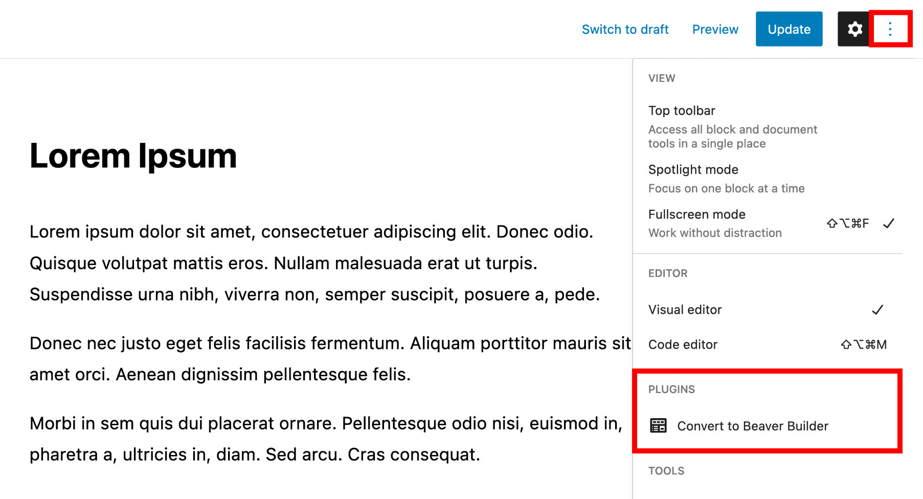 This article explains how to convert content from the Standard (block) or Classic editor in WordPress 5 to Beaver Builder and vice versa. It also describes the result of each type of conversion. Follow this link for how to install the Classic Editor plugin and how to open the Beaver Builder editor in WordPress 5.