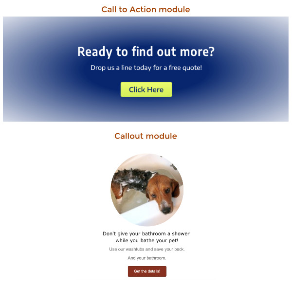The Callout and Call to Action modules are very similar, as shown in this screenshot, with a heading, some text, and a button, but their uses are often different.