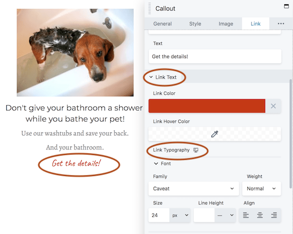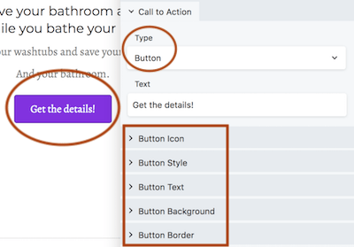 Settings for the text portion of the call to action: Text color and the Typography section.