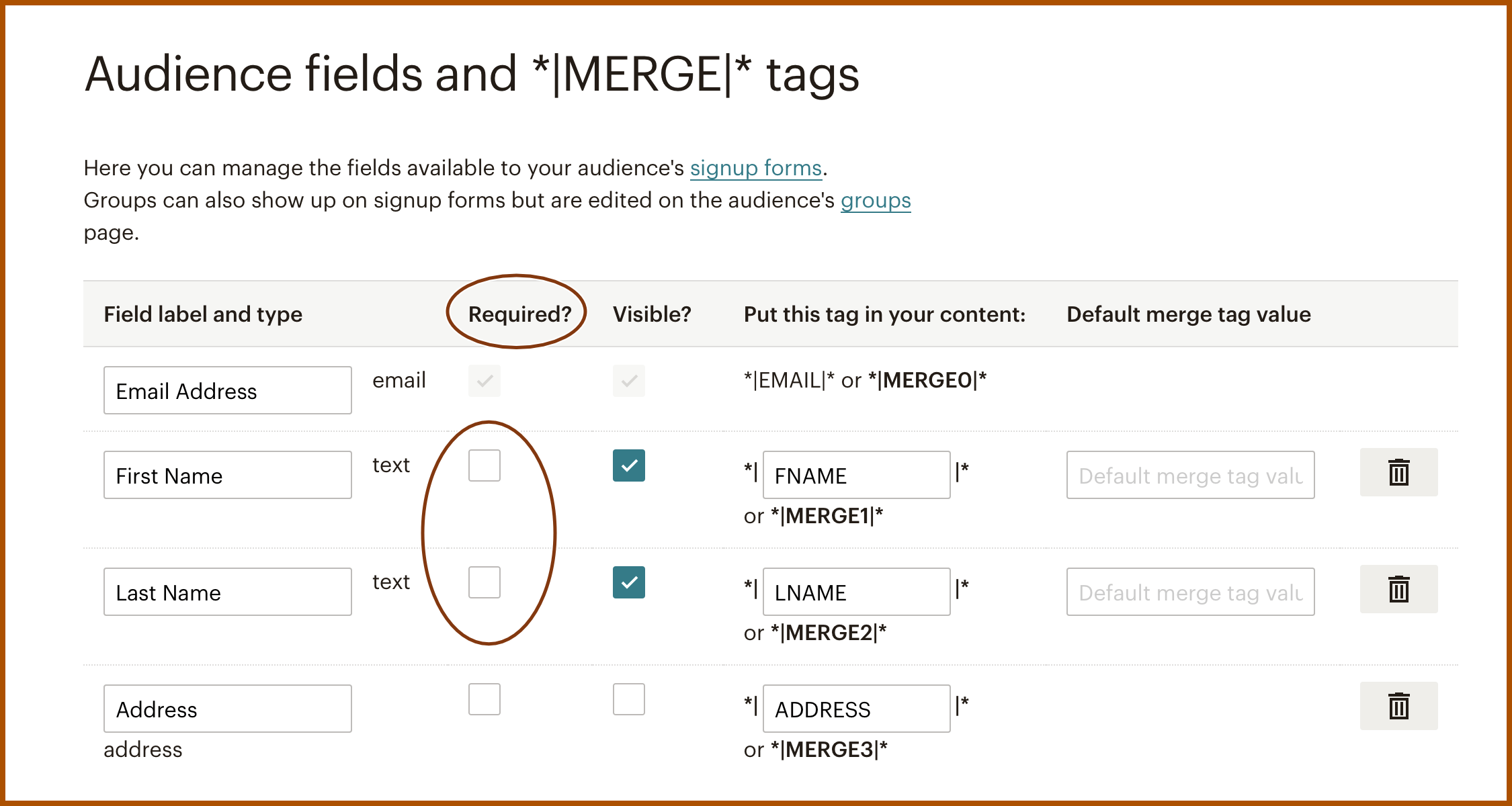 - Go to the Audience dashboard, then on the Settings tab, choose Audience fields and *|MERGE|* tags.