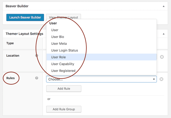 The conditional logic selections that appear in Themer layouts depend on the type of layout. In most cases, you can select not only logged-in vs. logged-out and user status, but also user properties such as user role, user capability, or even a specific username, as shown in the following screenshot.