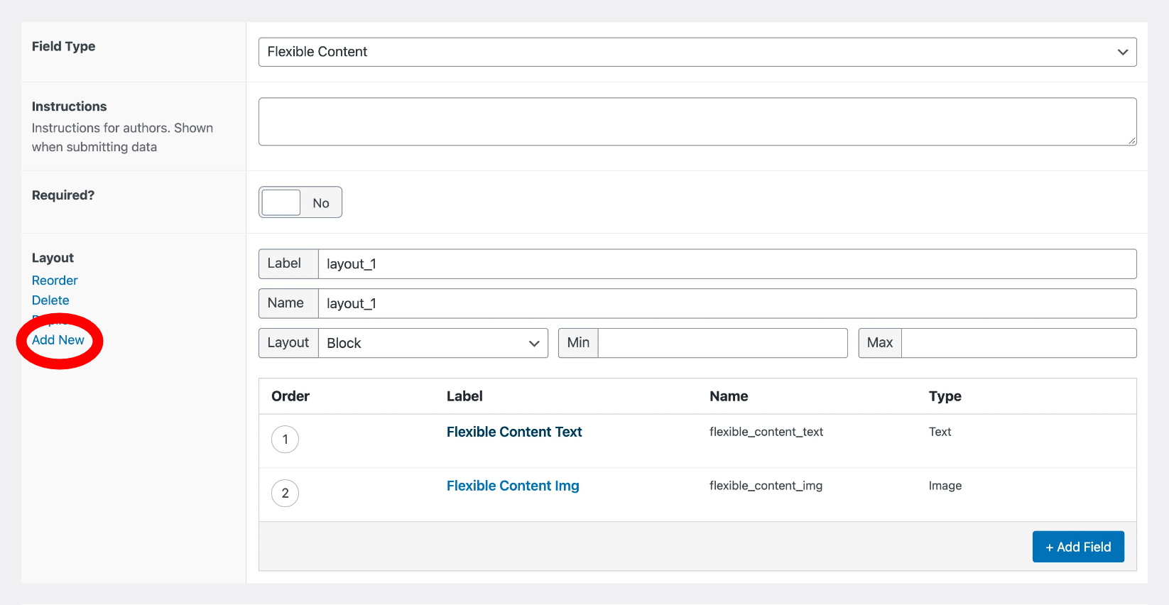 To add a new layout to the ACF Flexible Content field, click the Add New link on the flexible content settings located in the layout section, see image below.