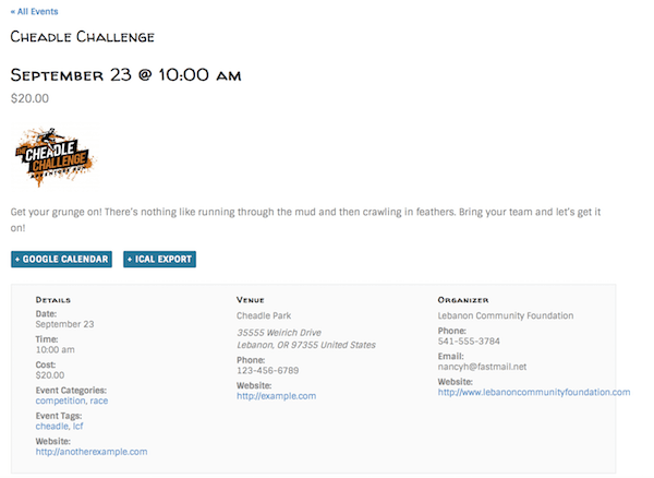 Clicking an individual event takes you to the single event page, which has all the details. This screenshot shows what the default single event page looks like: