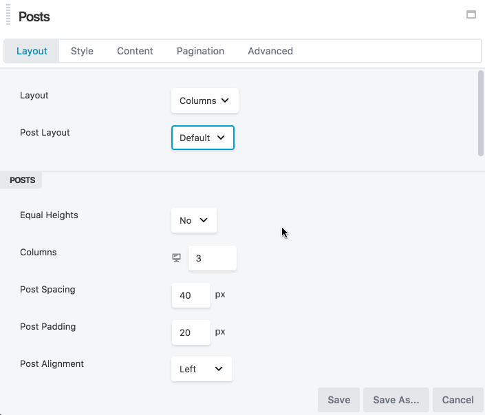 Tip: For best results, we recommend three columns of equal heights and 30px on post spacing options. - For Post Layout, select Custom.