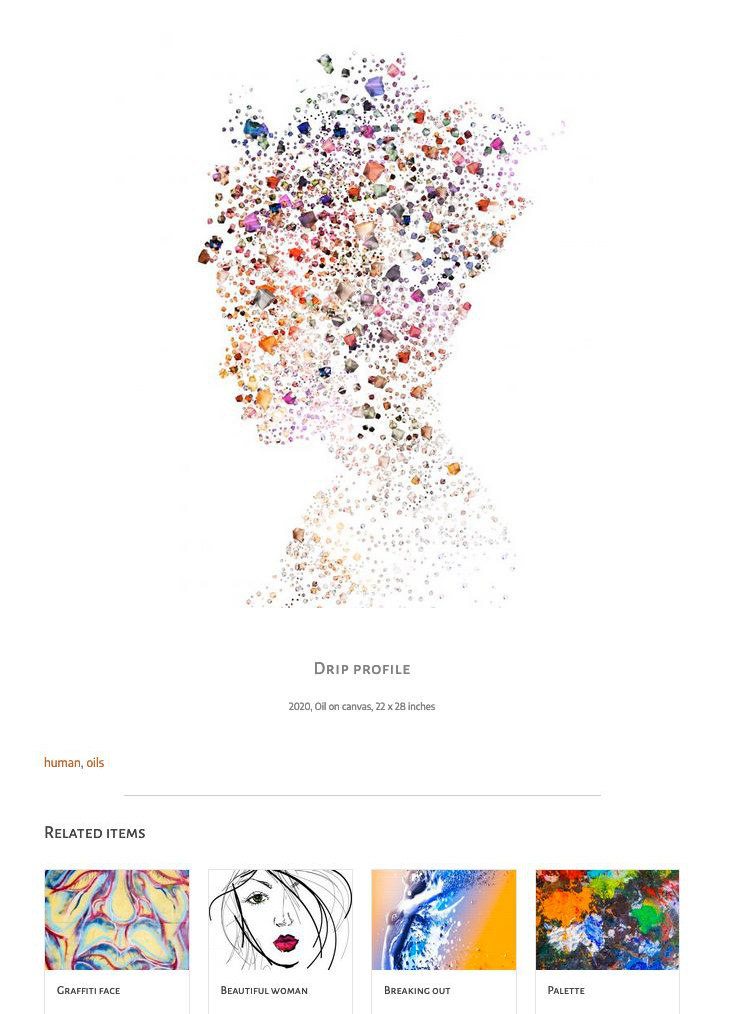 Here's a single item from a portfolio, created with a custom post type (CPT) and a custom taxonomy. The custom taxonomy terms (human, oils) are shown here so you can see how they apply in the final section called Related Items.
